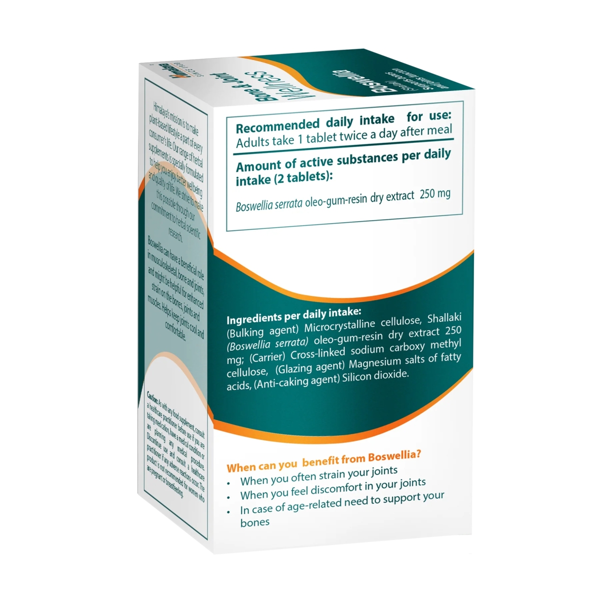 - С ЕКСТРАКТ ОТ BOSWELLIA SERRATA – Всяка таблетка съдържа 250 mg екстракт от Boswellia serrata, традиционно използван за подпомагане на ставите, подвижността и опорно-двигателната система. Подходящ за ежедневна активност, физическо натоварване или грижа за ставите с напредване на възрастта.